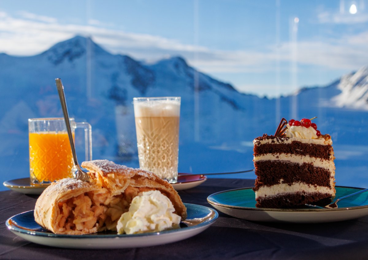 Wir empfehlen vor allem die Buchweizentorte, gefüllt mit „Grantenmarmelade“ (= Preiselbeermarmelade), oder die Cremetorte mit der harzigen Note der heimischen Zirbe. Am besten, Du besuchst unser Café am Pitztaler Gletscher und überzeugst Dich selbst!
